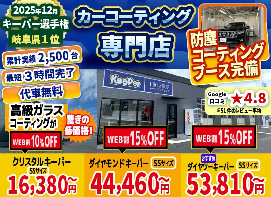 キーパープロショップ ファミリー可児店は、可児市・美濃加茂市・多治見市・関市・美濃・瑞浪市・犬山市・土岐市・賀茂郡(坂祝町・八百津町・川辺町)・可児郡御嵩町・各務原エリアのカーコーティング専門店として、日本ダントツのカーコーティングブランドであるキーパープロショップとして認定を受けております!
