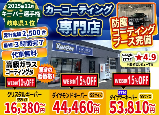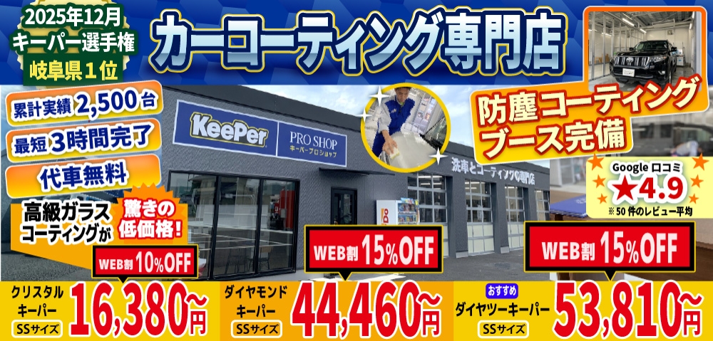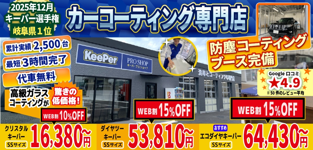 キーパープロショップ ファミリー可児店は、可児市・美濃加茂市・多治見市・関市・美濃・瑞浪市・犬山市・土岐市・賀茂郡(坂祝町・八百津町・川辺町)・可児郡御嵩町・各務原エリアのカーコーティング専門店として、日本ダントツのカーコーティングブランドであるキーパープロショップとして認定を受けております!