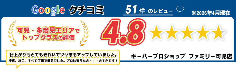 キーパープロショップ ファミリー可児店は、多くの可児市・美濃加茂市・多治見市・関市・美濃・瑞浪市・犬山市・土岐市・賀茂郡(坂祝町・八百津町・川辺町)・可児郡御嵩町・各務原エリアのお客様にご愛顧を頂き、おかげ様でコーティング施工実績が累計2,500台を突破!