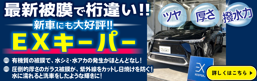 | 特徴 | ガラス被膜と、汚れの密着を防ぐ独特な防塵能力を持つECOプラスレジン被膜の二重構造。 EXキーパー同様に、雨での汚れの落ち方(自浄効果)がとても強く、ほとんど洗車をしないでもキレイなまま乗れます。 ※雨自体が黄砂等を含んで汚れている場合は、洗車をして頂ければ、キレイになります。 水シミ、紫外線の防止にもなり、クルマの価値を守ります。 一年に一度繰り返すことで塗装が守られるだけでなく、更に良いツヤが出て美しくなります。 |